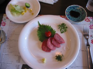 まず 地場産コースです。最初はラム肉のお刺身です。最初は岩塩で、次にショウガ醤油で。噛むほどにラムの味わいが深まって行きます。