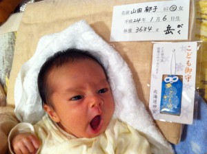 1月25日。出向元の会社の同僚からお守りを頂きました! でも、大あくびの岳です。(^^ゞ