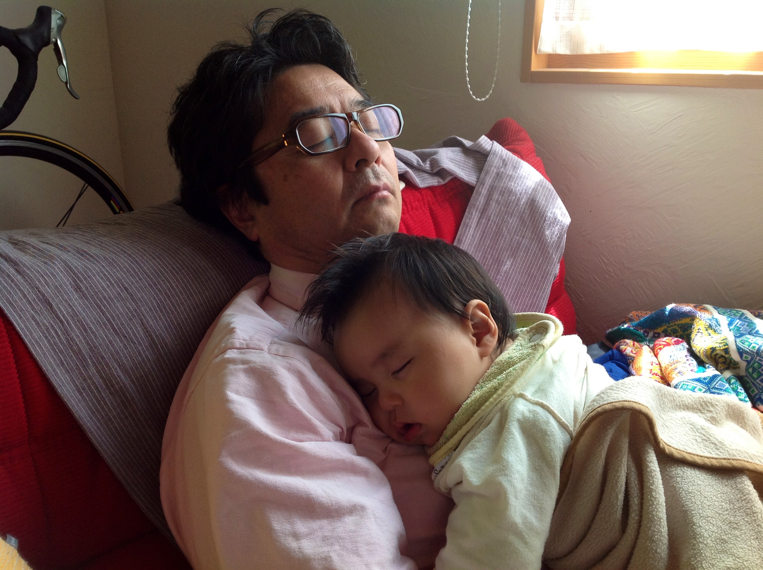 6月2日午前。岳の授乳後の眠りにお付き合いのお父さん。親子だな〜。