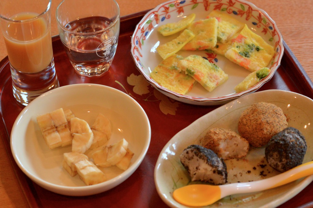 朝食メニューは、カフェオレ(タンポポコーヒー)、オムレツ、里芋の二色団子(きな粉と黒胡麻)、デザートにバナナです。