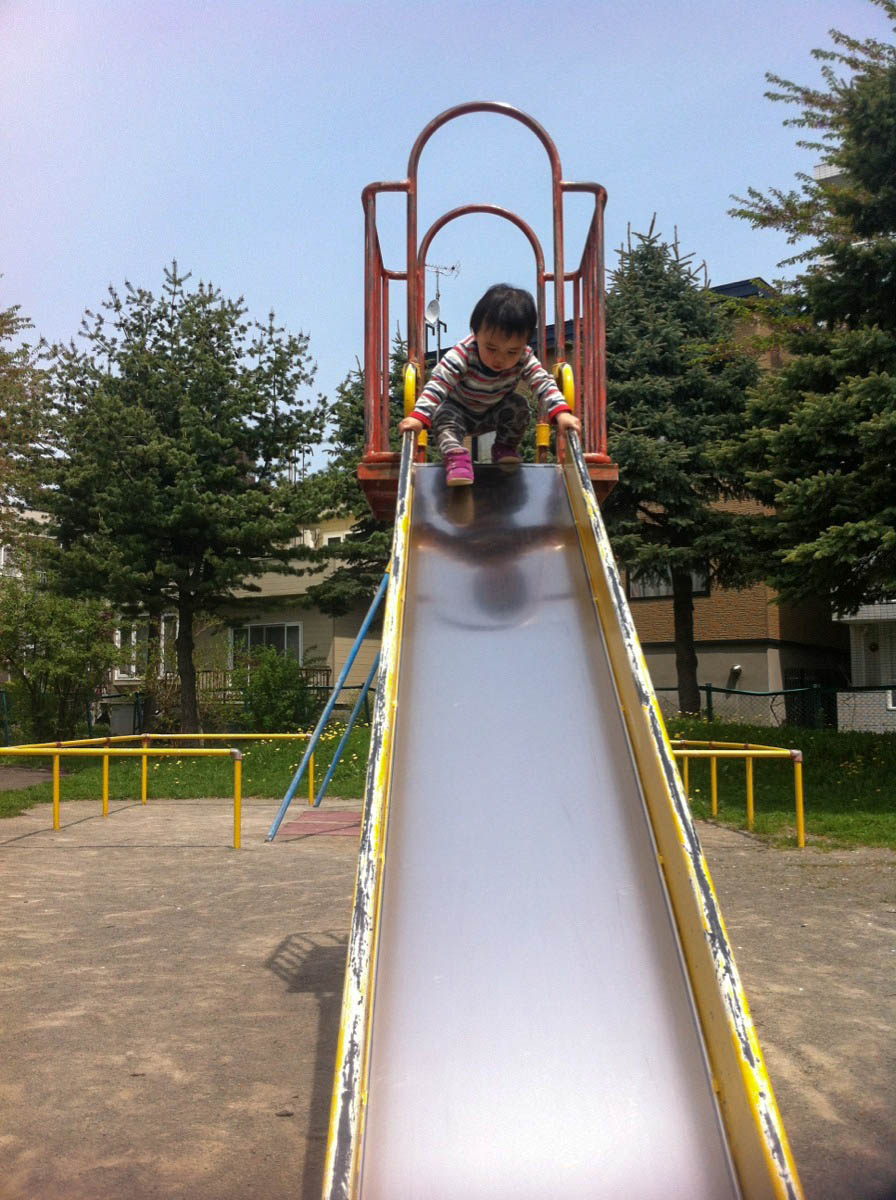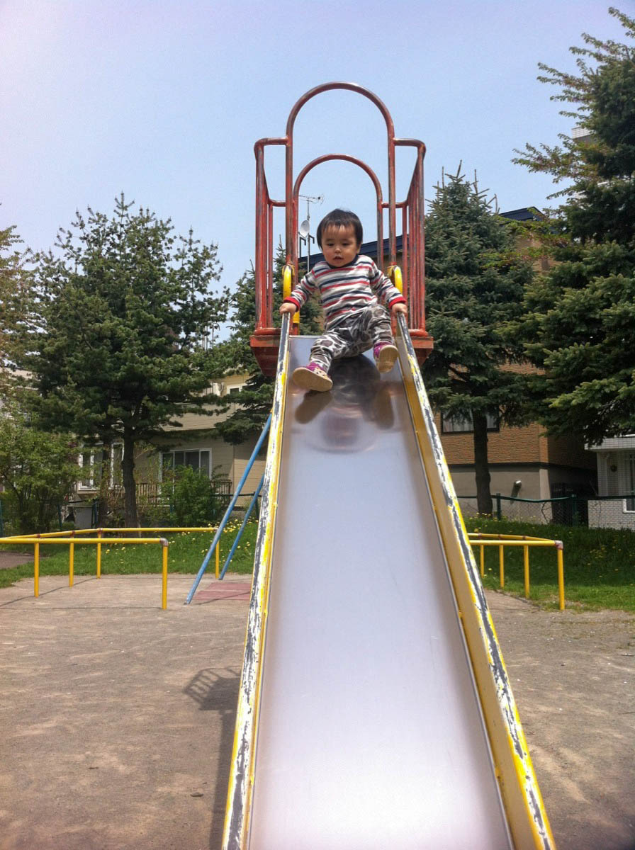 結構ダイナミックに、滑り台から投げ出される位のスピードで滑ってます。頭を打つんじゃないかとヒヤヒヤしましたが、おしりの方が心配だな〜。(^^)