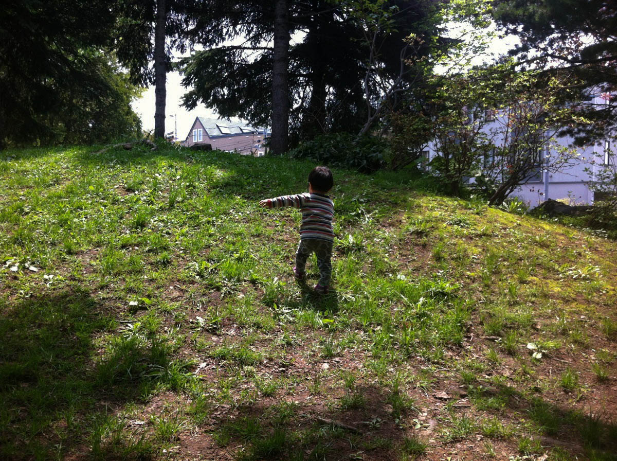 7〜8回滑って疲れたのか、今度は公園内を散策。小山を登ります。