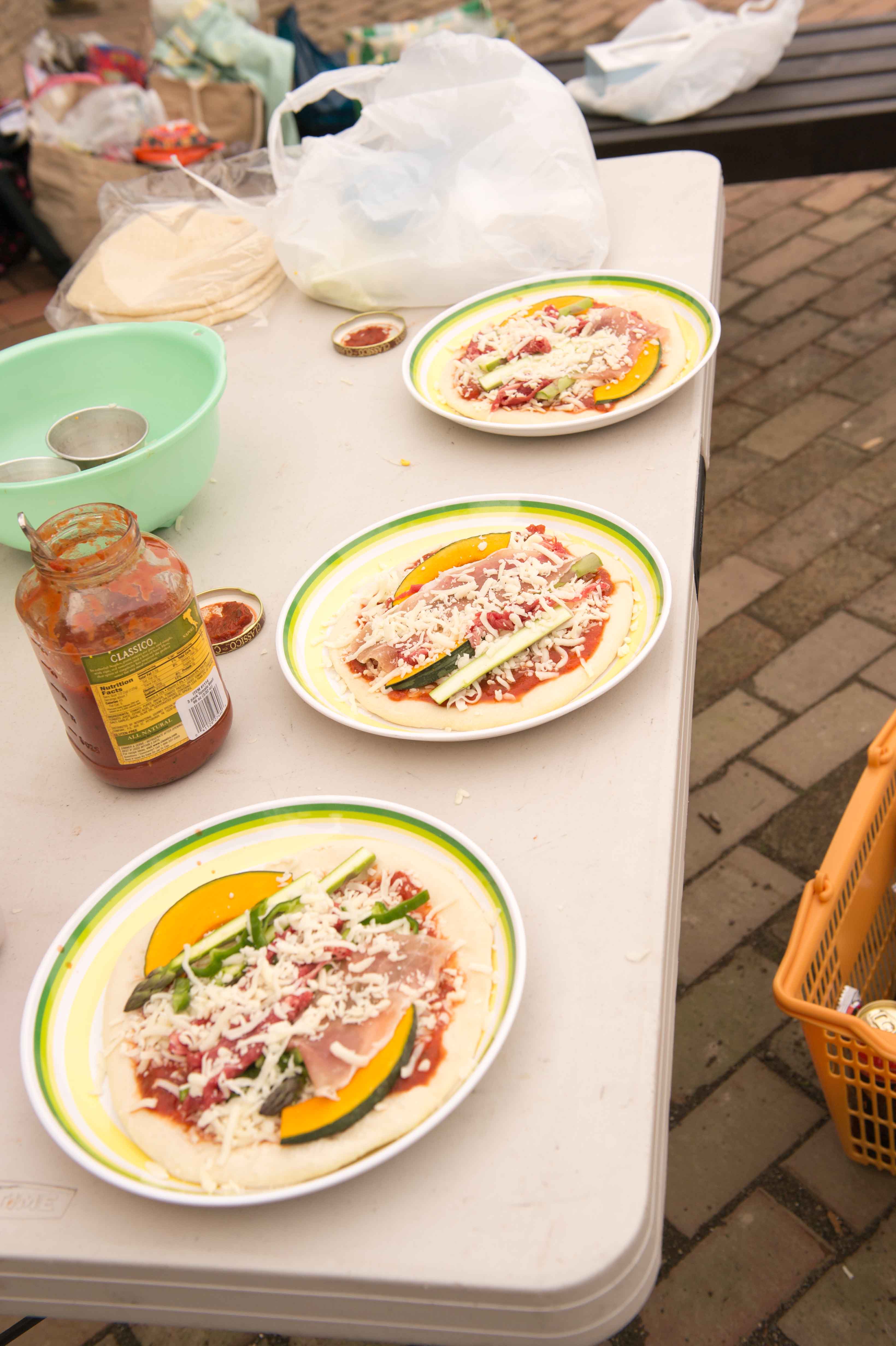 着いたら早速ピザ生地にピザソースを塗り、持参したトッピングを並べます。