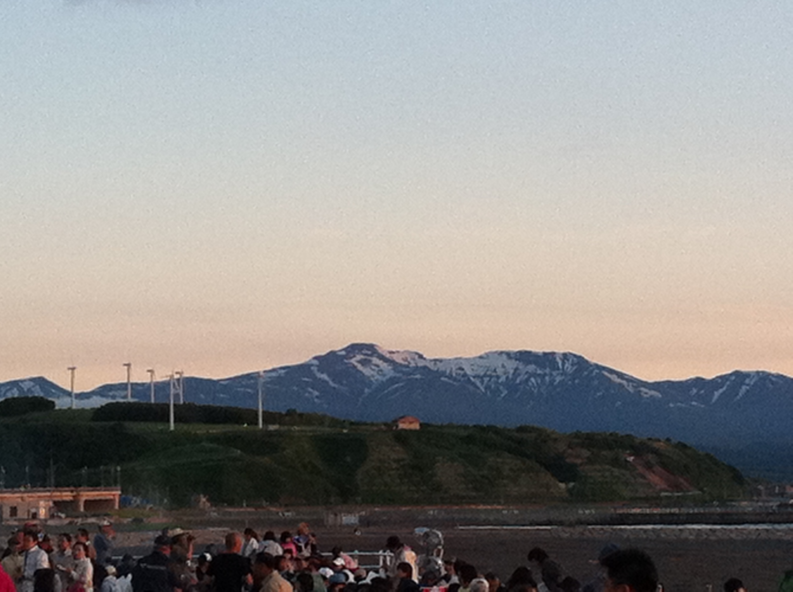 暑寒別手前の山々には未だ残雪が残っています。風力発電も盛んなようです。