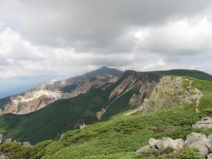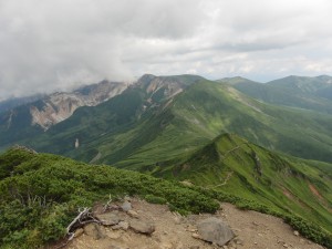 体調が良さそうなので、三峰山を経てかみふらの岳廻りで下山することに。左の写真で、雲に隠れていない中央付近のピークがかみふらの岳で、そこからの左下への稜線がルートです。