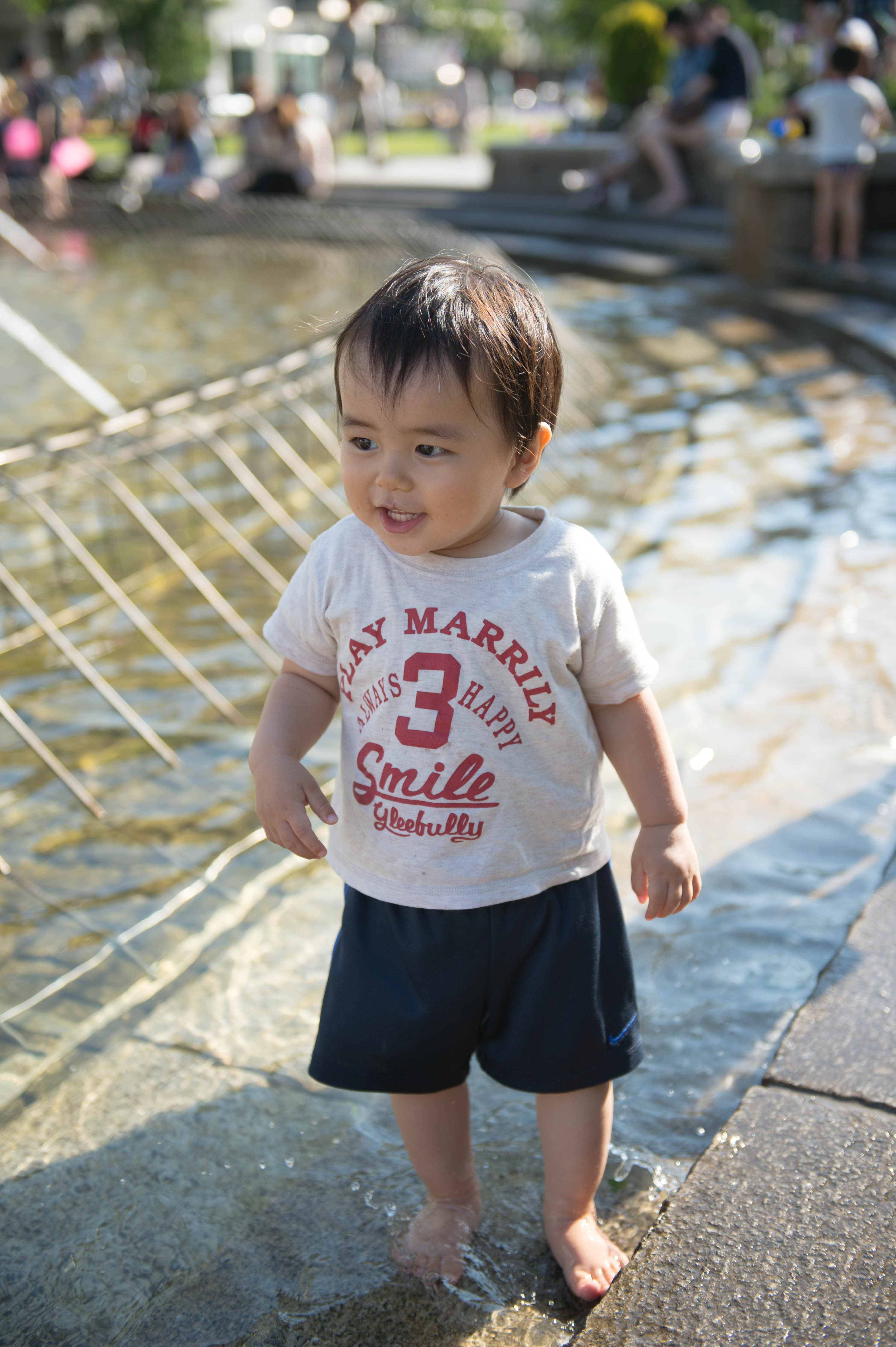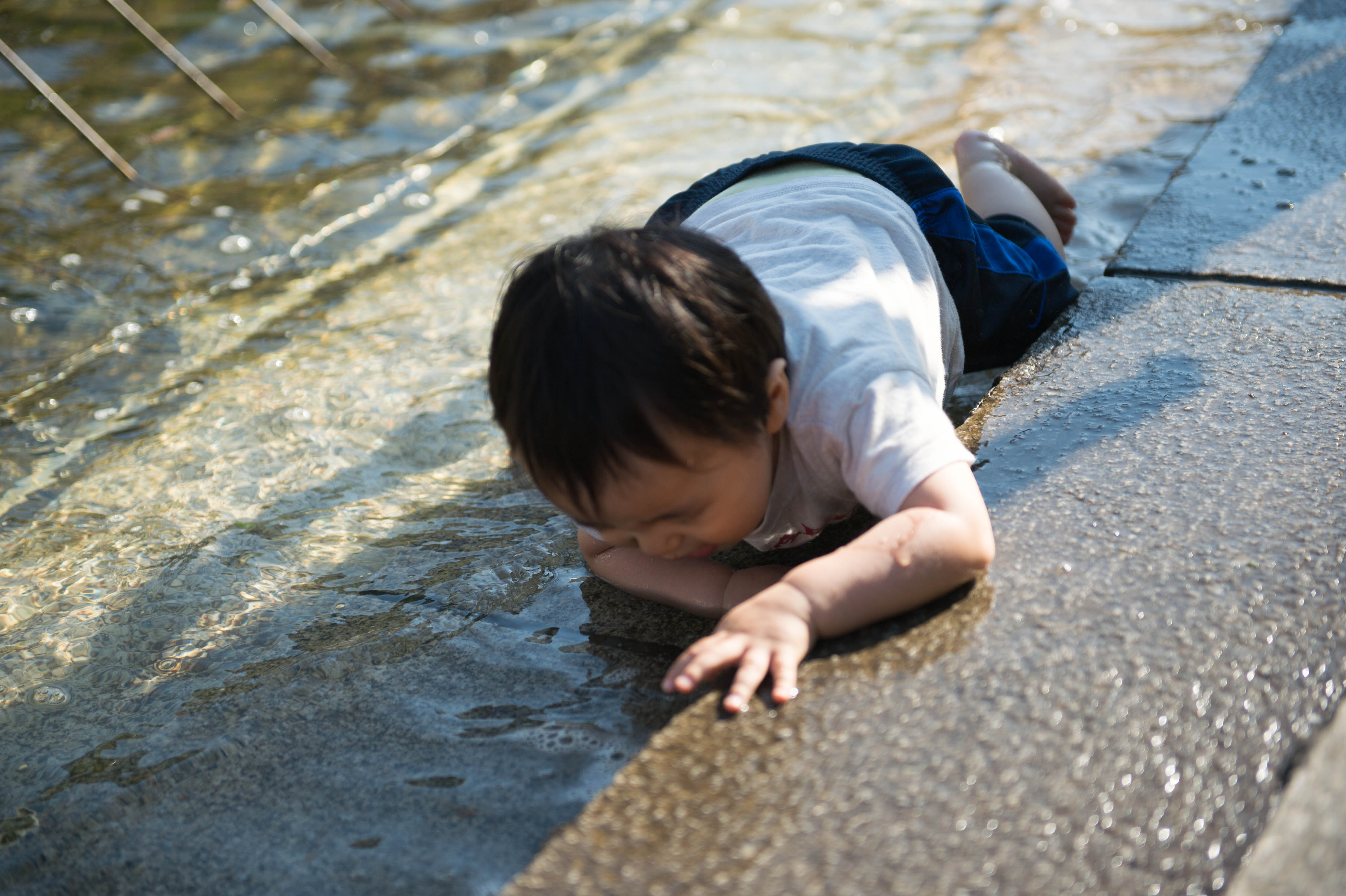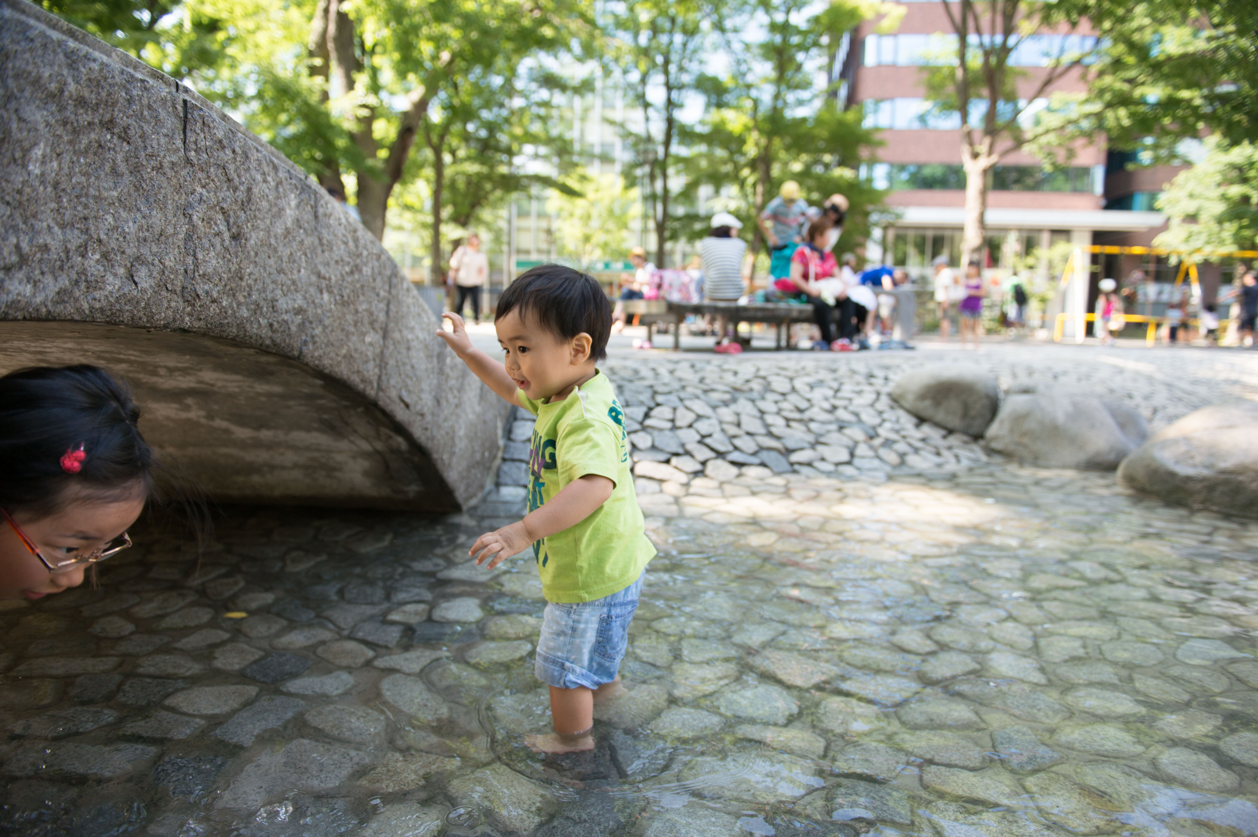 ここからは岳と二人です。滑り台の隣にある、水場を見つけて大喜びの岳です。橋の下を潜る女の子を見つけ、この後自分もチャレンジ!案の定、ズボンの裾を濡らしました。その後も、走り回る他の子の水を浴びて、シャツもびっしょり。(^^;