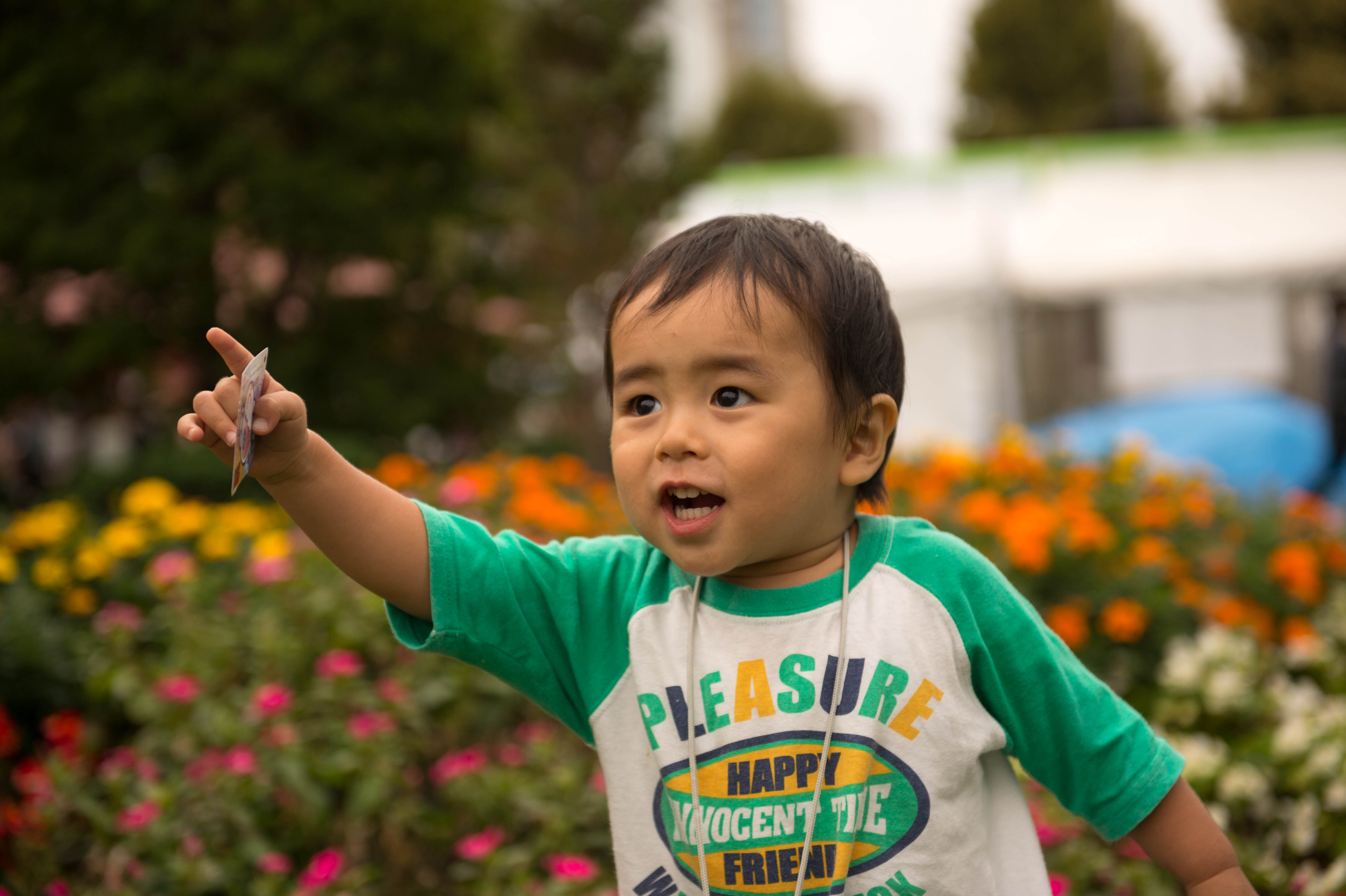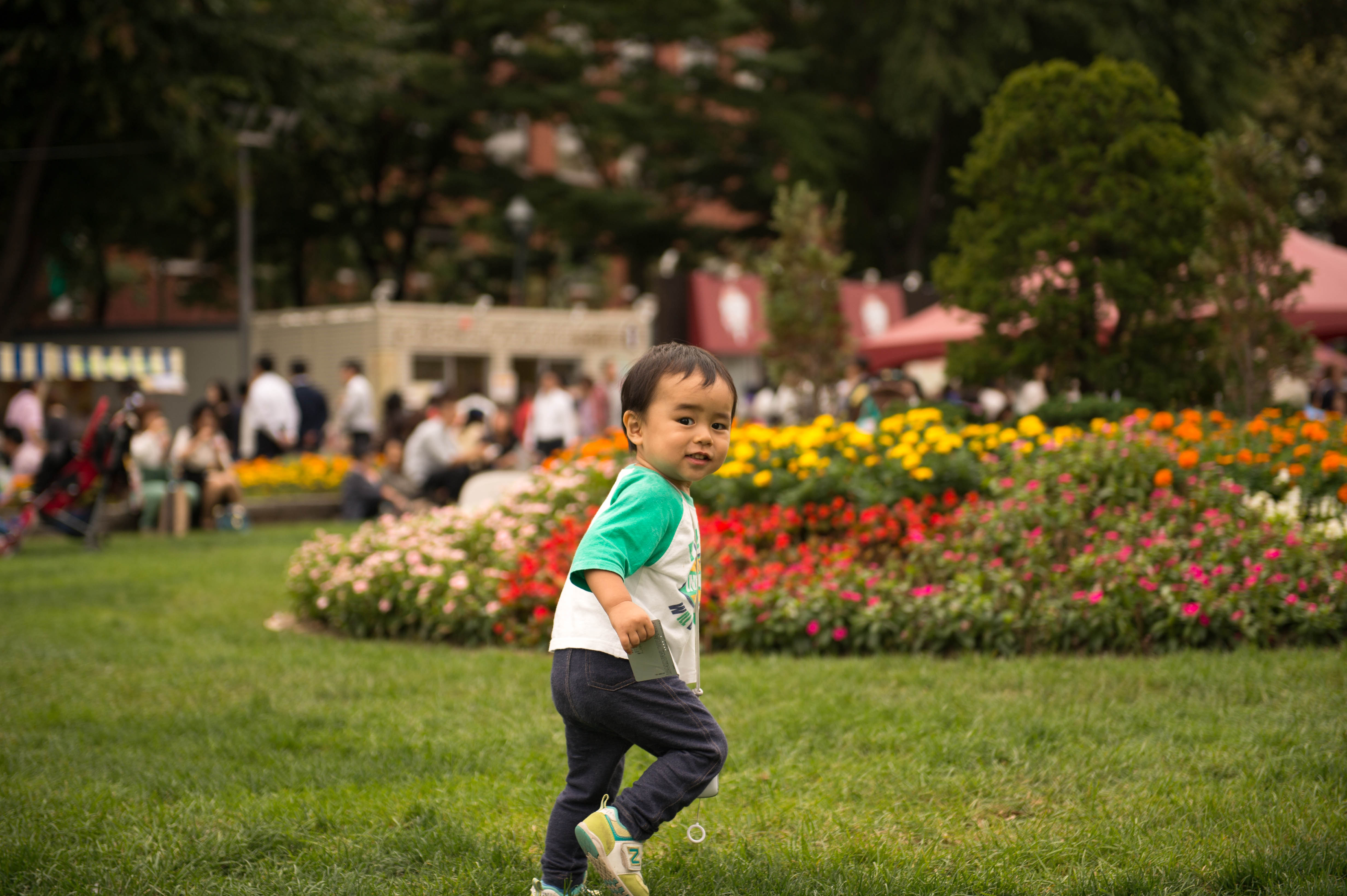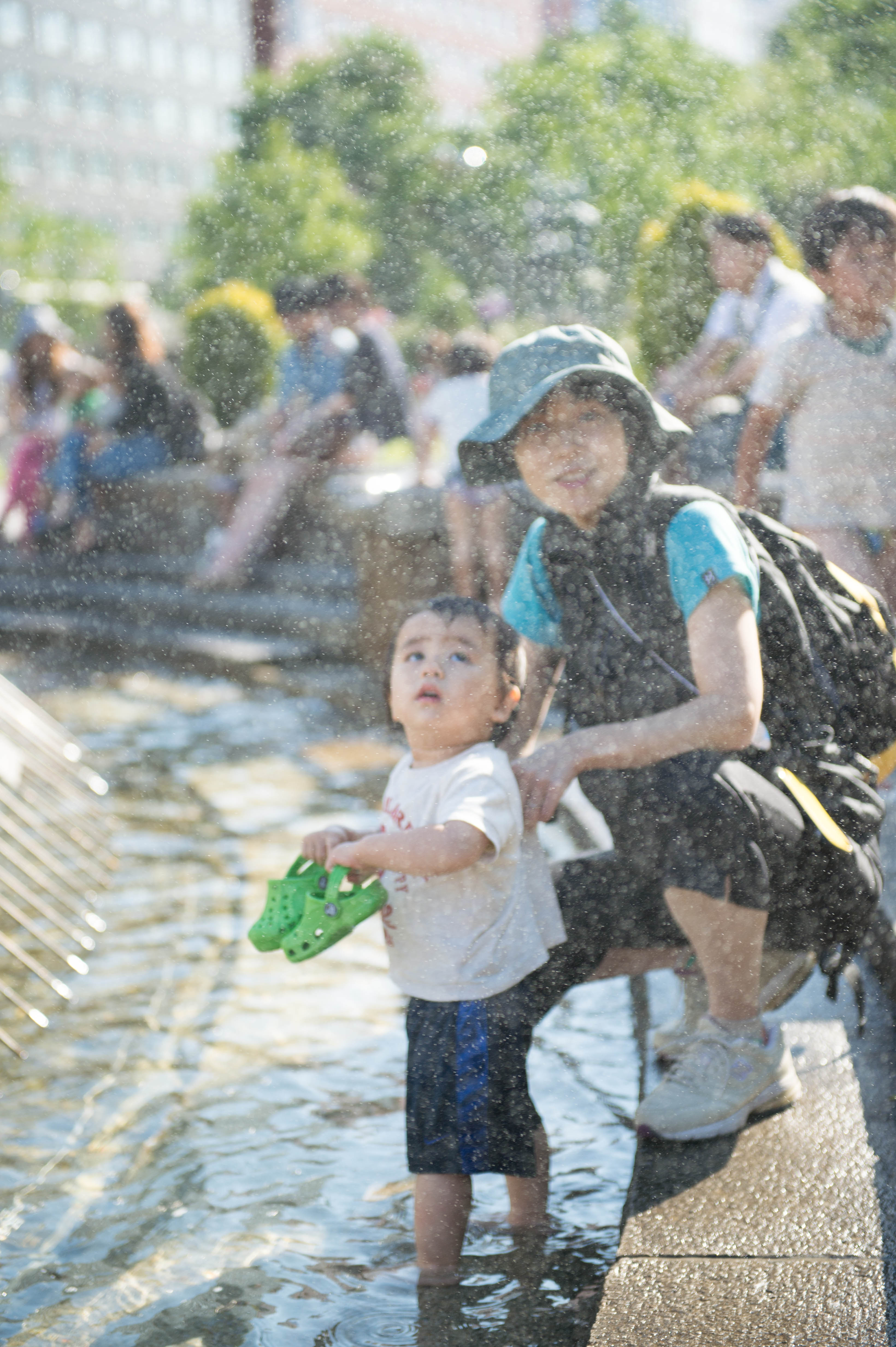 ここからは岳と二人です。滑り台の隣にある、水場を見つけて大喜びの岳です。橋の下を潜る女の子を見つけ、この後自分もチャレンジ!案の定、ズボンの裾を濡らしました。その後も、走り回る他の子の水を浴びて、シャツもびっしょり。(^^;