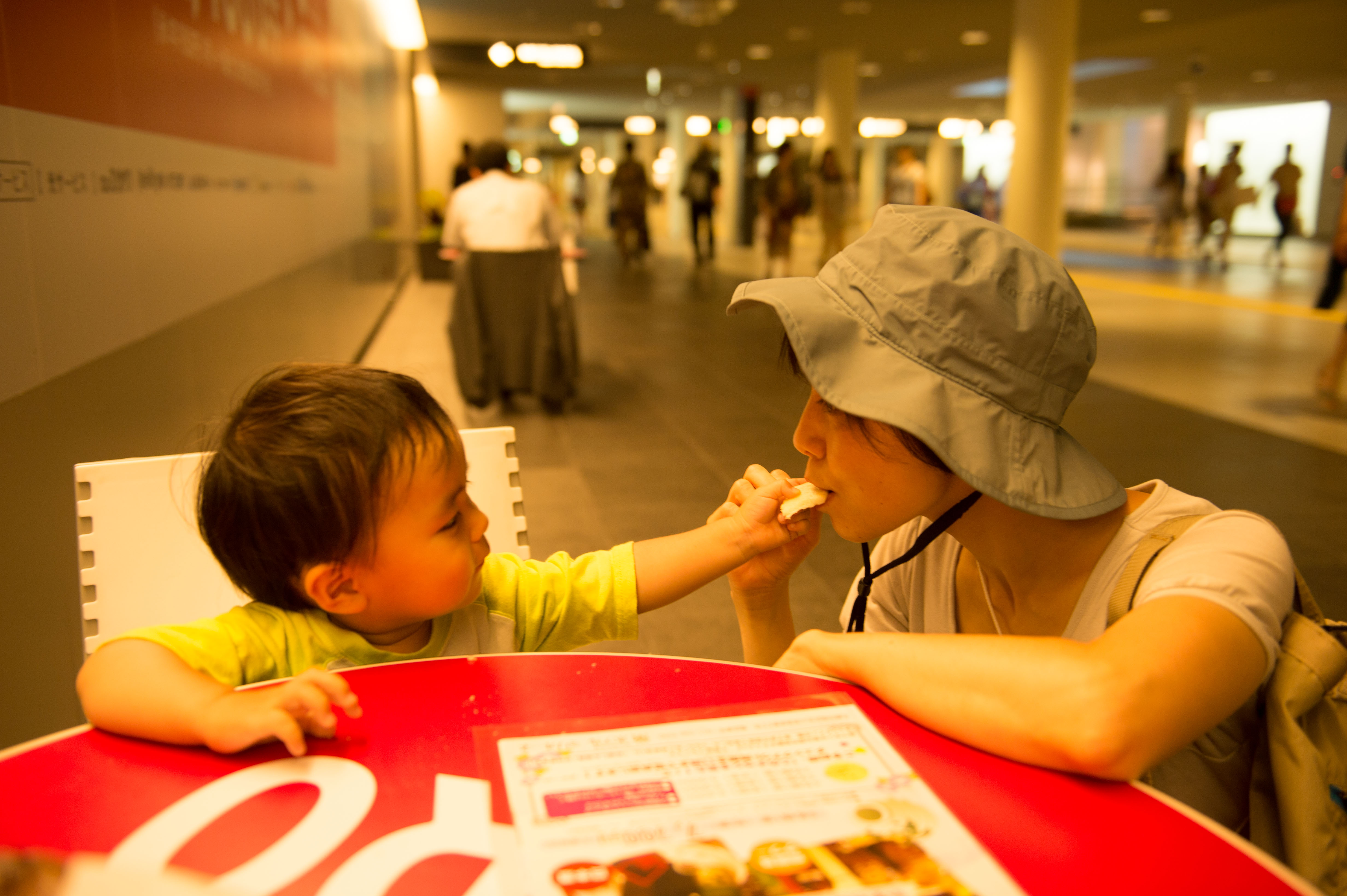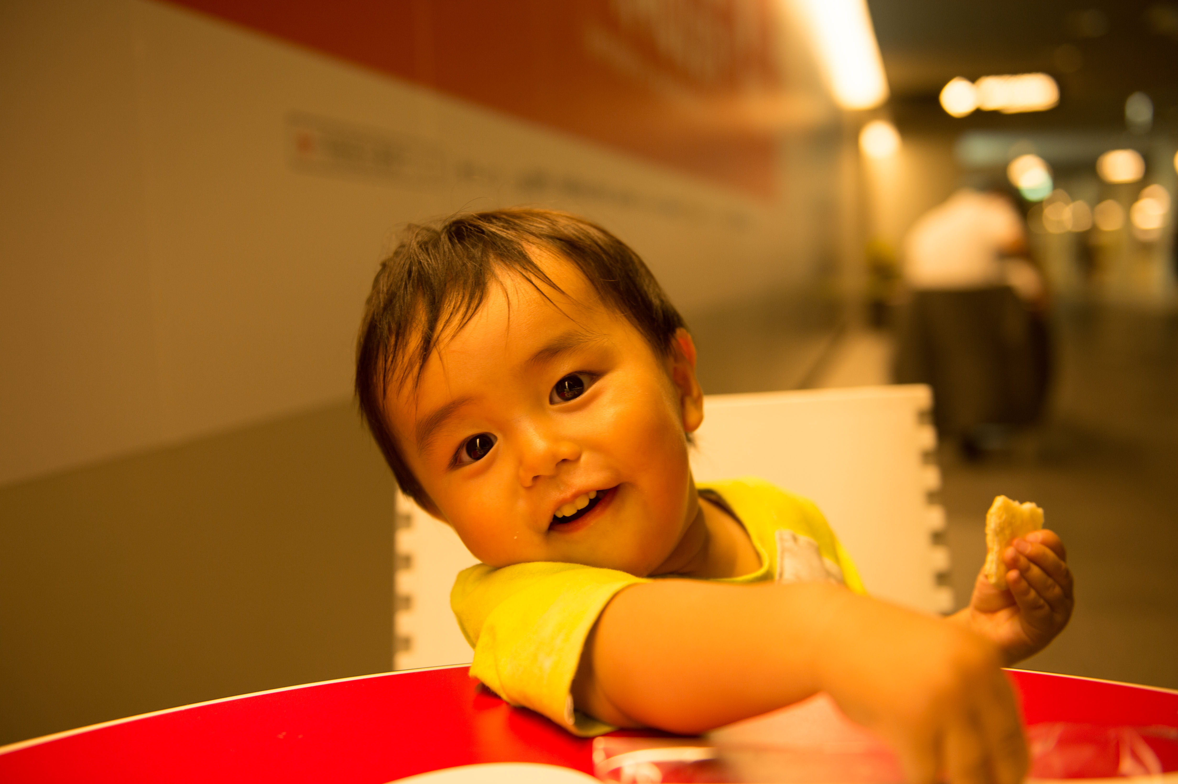 鼻水が出てきたので、病み上がりの岳をこれ以上ここで遊ばせるのはやばい!と、予備のシャツとズボンに着替えさせて、抱き抱えてボーネルンドへと!ここでいろいろと遊んだ後、グランドホテル前の地下街でおやつを食べながら郁ちゃんを待ちました。