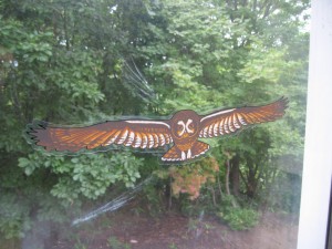 何羽もの小鳥が、窓に激突して死んでゆきました。なんとかしたいなぁ、と思っていたところ、知床自然センターで見つけた「野鳥衝突防止コミミズクステッカー」が効果てきめんでした。