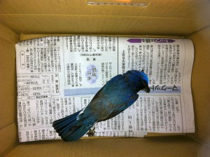 来るのですが、今日は何を間違ったのか、窓に激突してしまいました。外に出てみると窓に下で動けずに横たわっています。雨が降っており、気温も低いので、拾い上げて暖かなところで回復を待ちます。