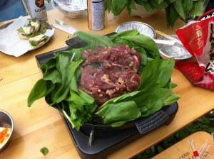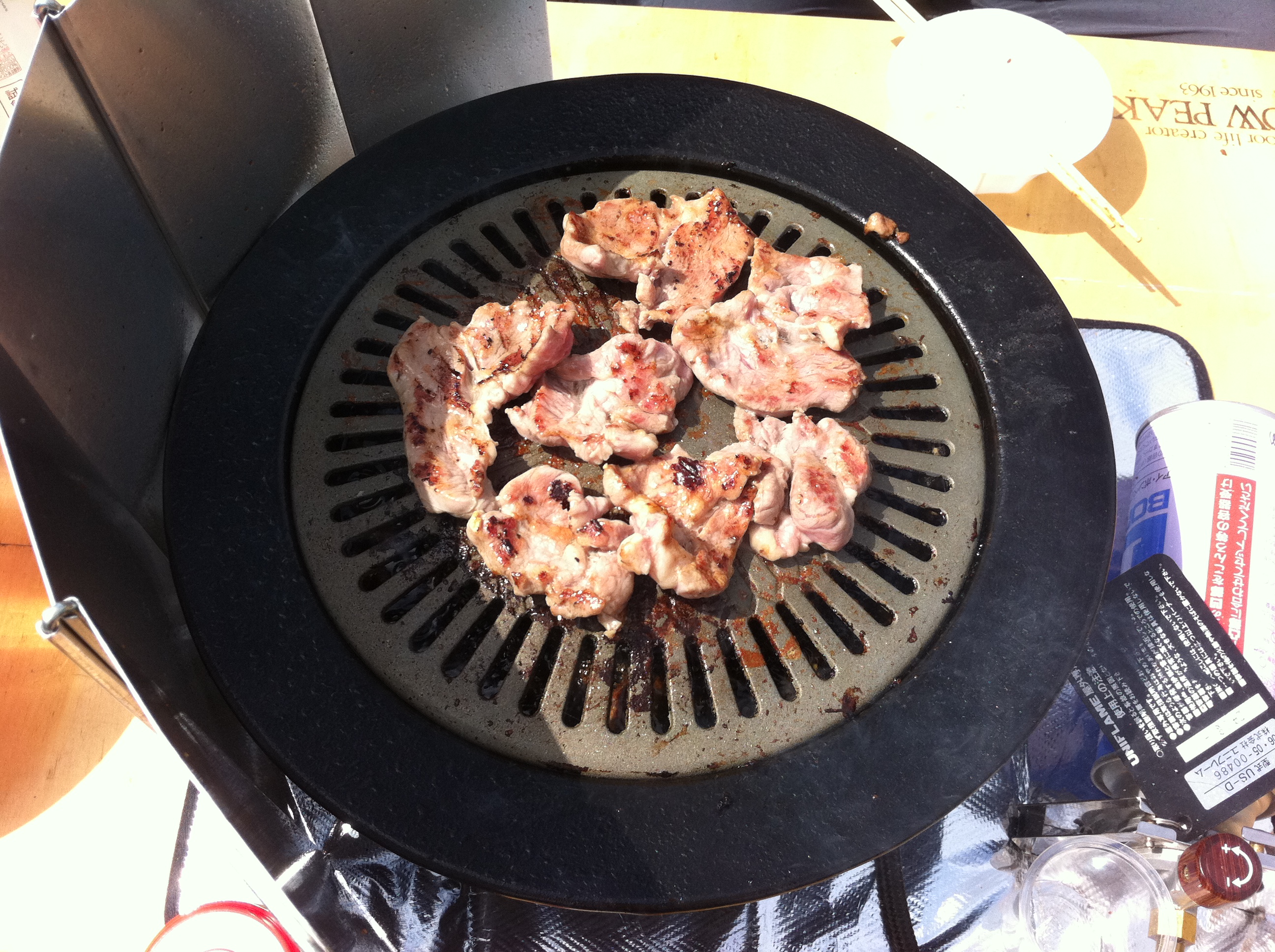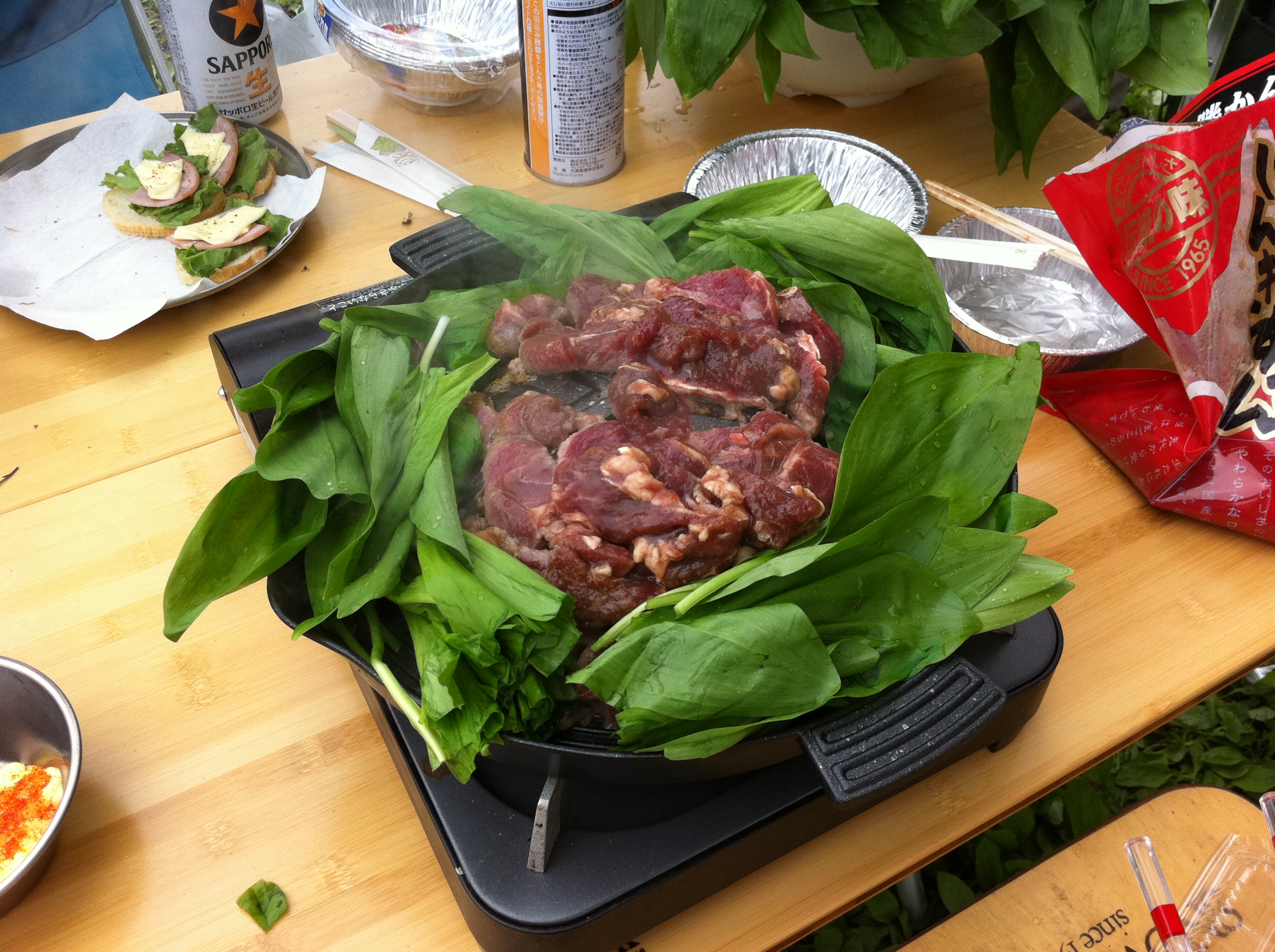 参加者約80名。食材は持って行ったのですが、大量の山菜天ぷら(こしあぶら、ウド、コゴミ、等々)、こしあぶらご飯、その他美味い物があっちからこっちから回ってきて、持参の食材を調理する前に腹一杯。ごちそうさまでした!
