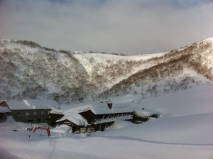 毎年恒例のニセコ合宿。今年は二日目に五色温泉の湯治部で自炊し、翌日はイワオヌプリを滑ろう!と言うことになりました。五色温泉裏の沢にシール登行している7名が見えます。