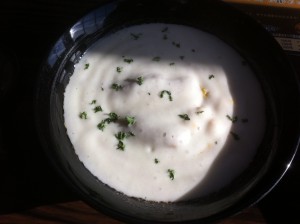 ポロネギです。又やってしまいました。写真を撮る前に手をつけてしまった!味はネギの甘さが味わえる一品です。軽く塩が振ってあり焦げ目が付くように焼かれています。ワインビネガーベースのドレッシングがまたポロネギと絶妙に合っています。