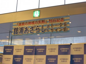 舘浦あざらしさんの「温泉の神様の失敗」刊行記念トーク&サイン会に行ってきました。あざらしさん初の小説出版です。虚実おり混ざり、愛とスラップスティック、まるでSF小説のような面白さでした。今まで「北海道いい旅研究会」とメルマガで の文章でしか知りませんでした。一昨年一度トークイベントに出席するつもりでしたが、急用が出来参加できず。今回初めてお顔を拝見させていただきました。 但し会が始まる前に主催者から写真撮影は禁止だと!なんでかな〜と思っていましたが、トークの中で、「顔を知られずに温泉宿に行き、普通の一般客として対 応してもらってこそ、本音の記事が書ける」と。納得です。しかし「宿を出る時に、あざらし本人であることを明かしたときの相手の表情が面白い」と! あま り良い人では無いかも。(^^)