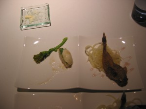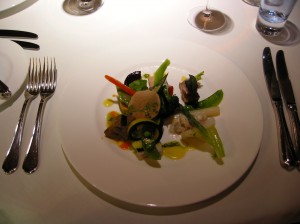 先ずは、前菜です。それぞれの野菜に下に、鴨、タラ、フォアグラ、キングサーモン、等があり、野菜の風味を引き立たせてくれる品々でした。