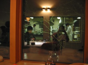 目の前の窓の外は横殴りの吹雪ですが、窓に映った我々の後ろには、キビキビと調理するシェフとスタッフの姿が。