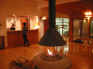 エントランスではオープン暖炉が迎えてくれます。厨房はガラス張りになっており、ここからも覗けます。席に着くと既に4席ほどで食事中。本日の野菜のメインはポロネギだそうです。