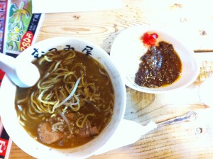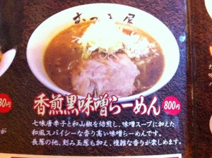 色々 考えたけど、結局お昼はむつみ屋月形総本店。当別町店とは麺も太麺細麺が有ったり、メニューも当別町店に無い物も有ったり、違いがあるんだ!当別町店では いつも「北の恵」ですが、総本店独自メニューの「香煎黒味噌らーめん」と「牛すじカレー」セットにしました。 またしても写真撮る前に食べ始めました。m(_ _)m でも、コクのあるスパイシーな味噌らーめんで、美味しかったよ!