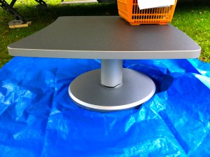 原 因が分かりました。このままでは折れてしまうと思い、天地をひっくり返してみると、木ねじが6本落ちてきました。台座とテーブルの脚を接続しているねじで した。台座の支えが無くなり、脚だけで天板の重量を支えきれずにプラスチックの脚に亀裂が入り、移動中の振動で徐々に大きくなったようです。振動により木 ねじが緩むことは聞いていたので、購入後半年、1年目に増し締めは行いましたが、まさかテーブルの中が木製だとは、木が、いやいや、気がつかなかった。(^^ゞ